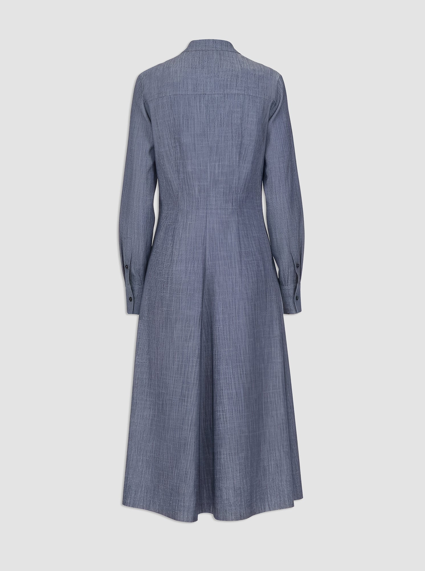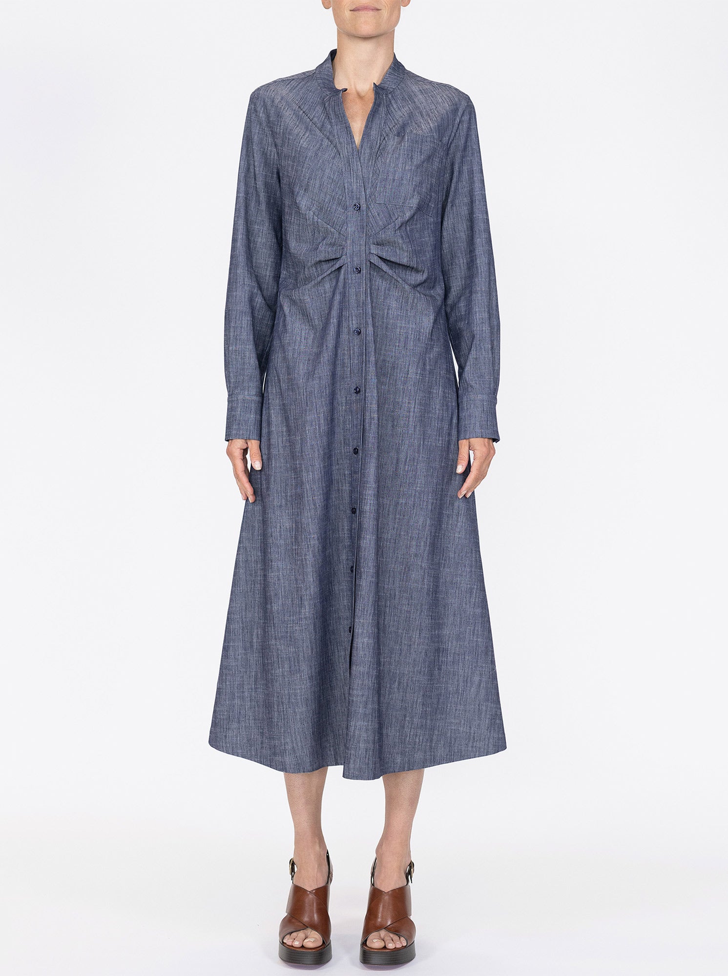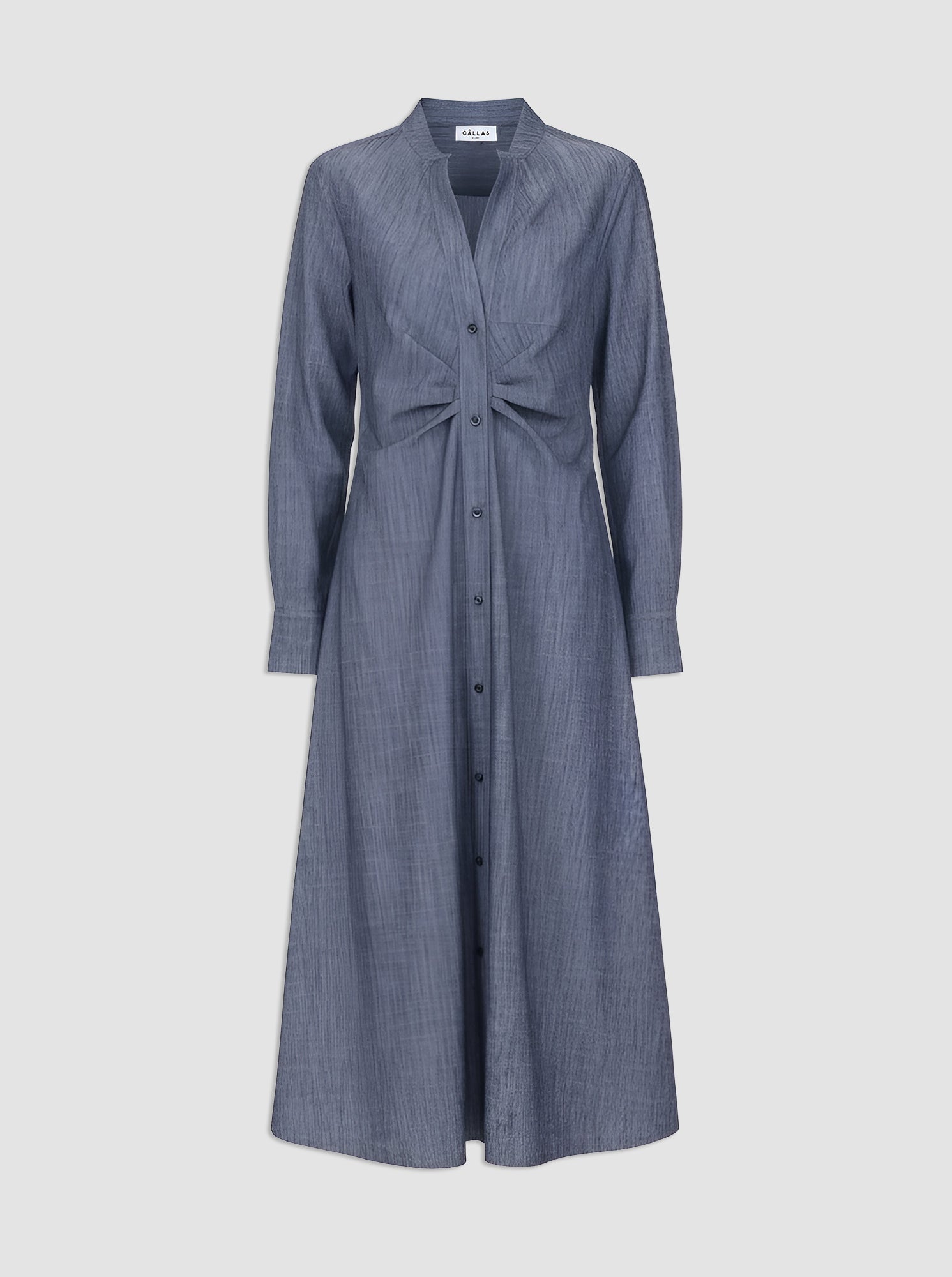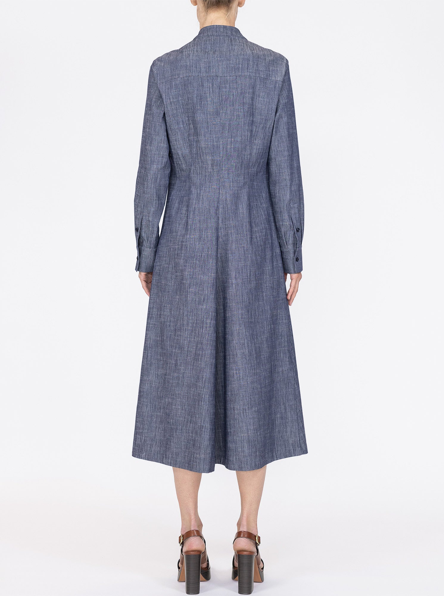 The Genny is a button front, long sleeve version of one of the favorite dresses in the Câllas collection, the Noor. Featuring a fit and flare silhouette, a-line to calf length hem. It has a small band collar and an open front neckline. With slim sleeves ending in shirt button cuffs. There are tucks at the front of the dress, which creates a flattering fit. The Genny is made from a stretch chambray light weight fabric with a denim look. Unlined