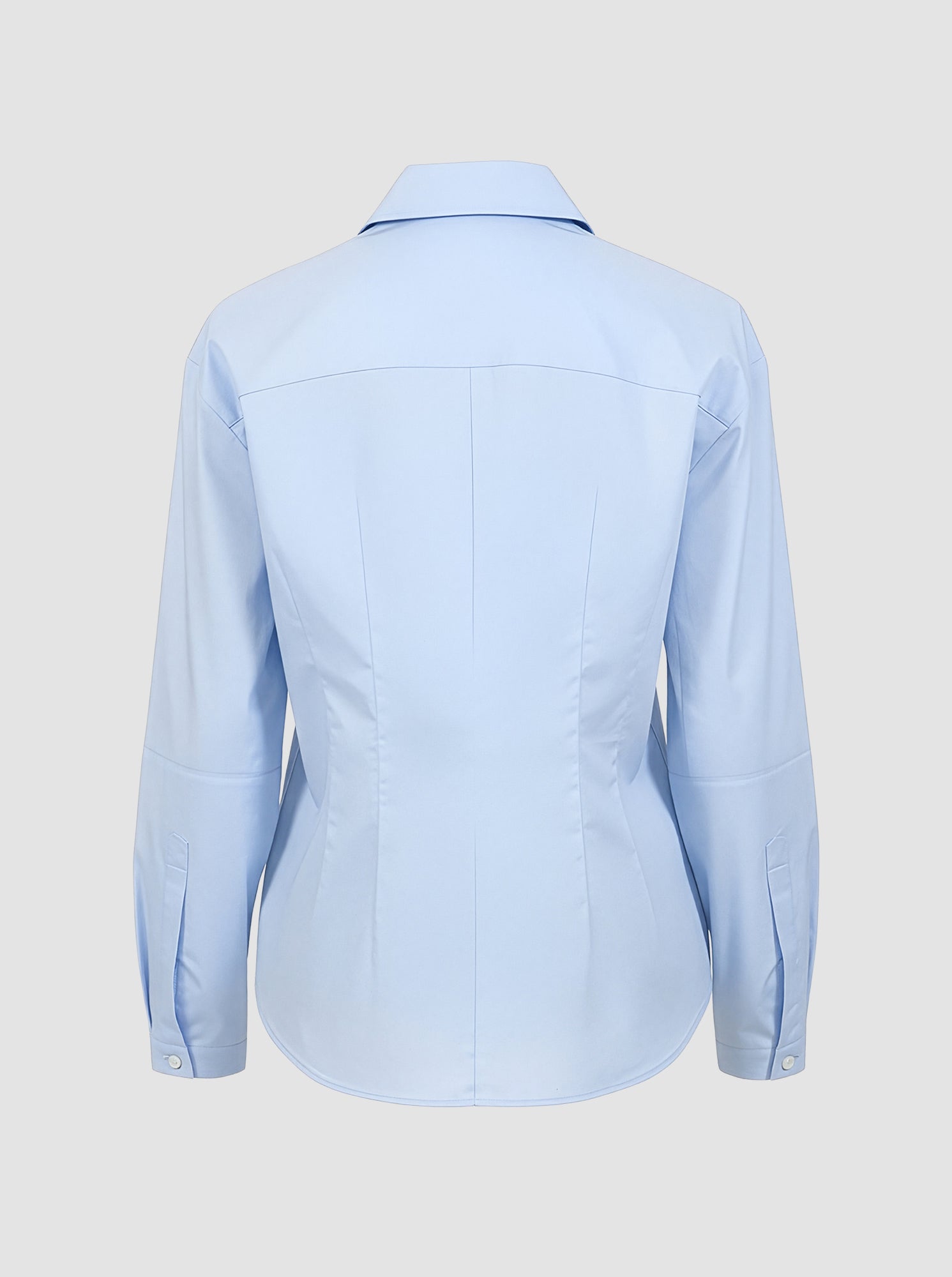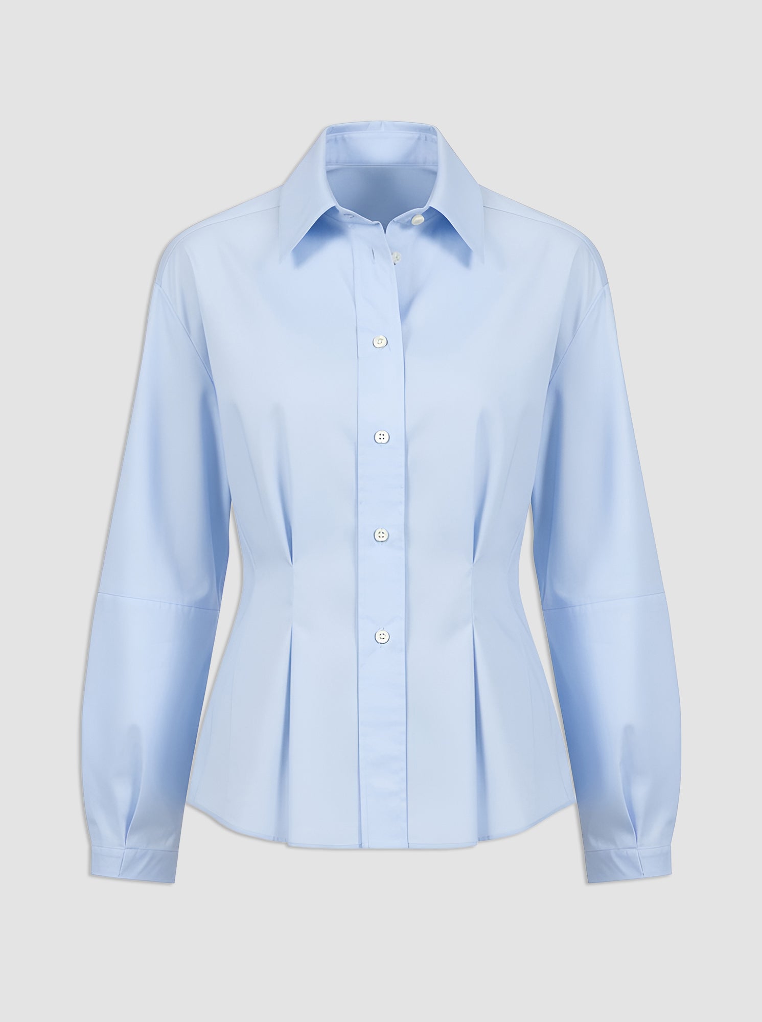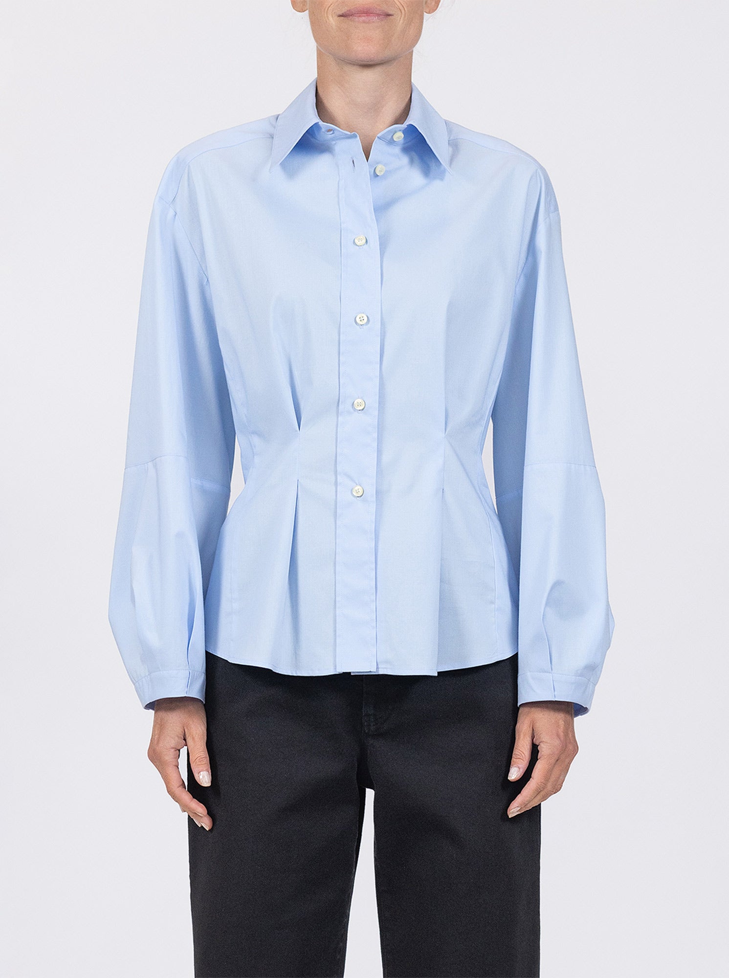 Lucia is a button front, point collar shirt with a fit and flare body shape created with pleated front detail. The full length sleeves feature a lantern shape also created with pleats. Made in a crisp cotton poplin