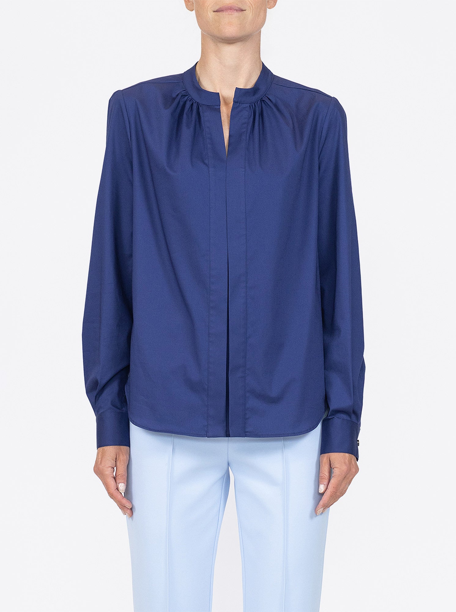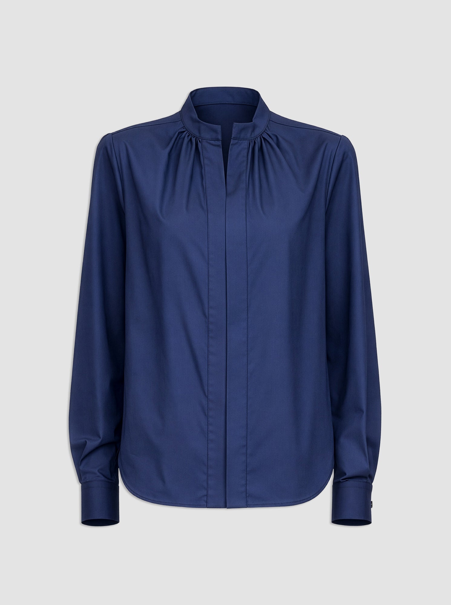 With a slim silhouette cut from crisp cotton poplin, the Olympia shirt proves polished for any number of occasions. The buttonless front placket and the small band collar lend a modernist appeal. button cuffs finish the long sleeves.