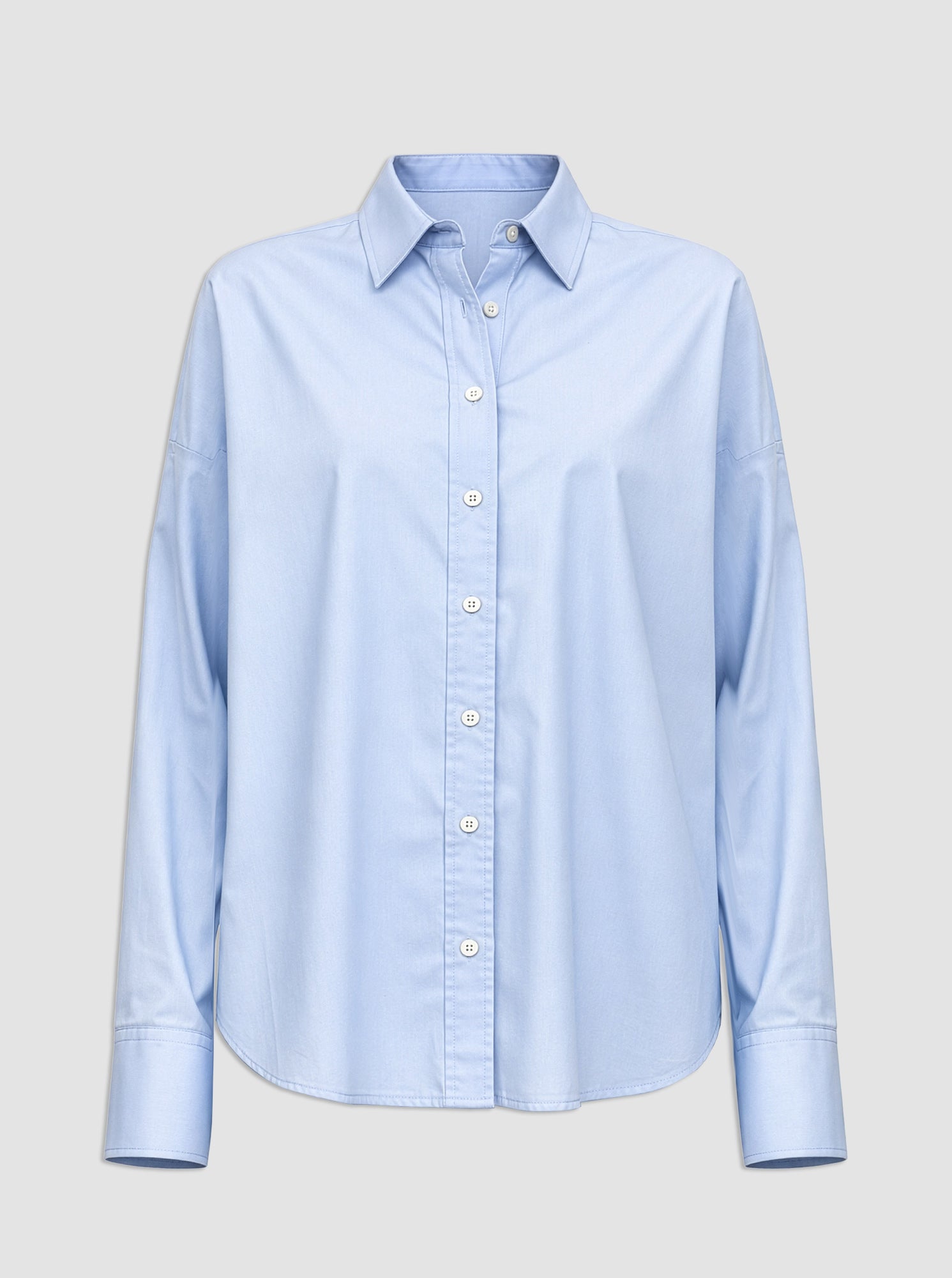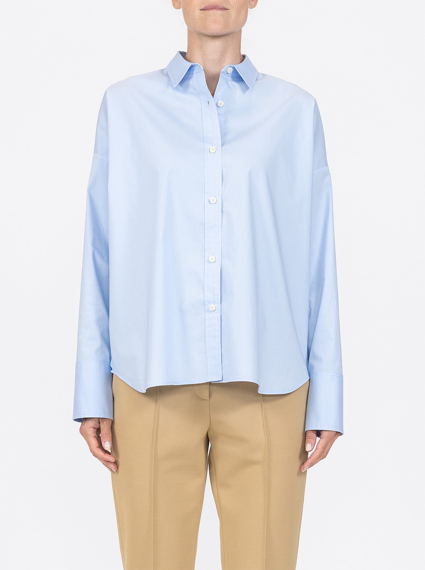 The Sirene has a small point collar and button front placket closure. The dropped shoulder line is balanced with slim sleeves which end with classic button cuffs. The body shape is square, with an easy relaxed fit.