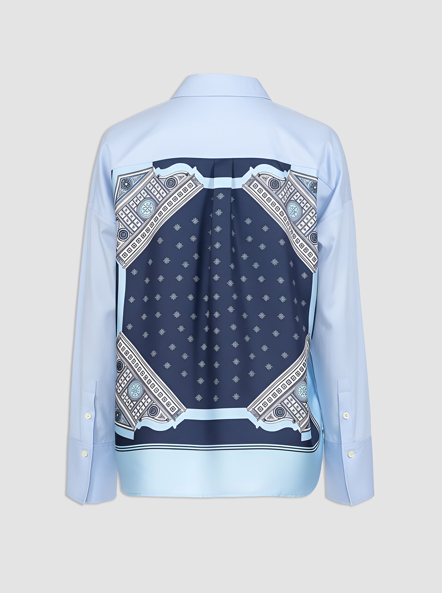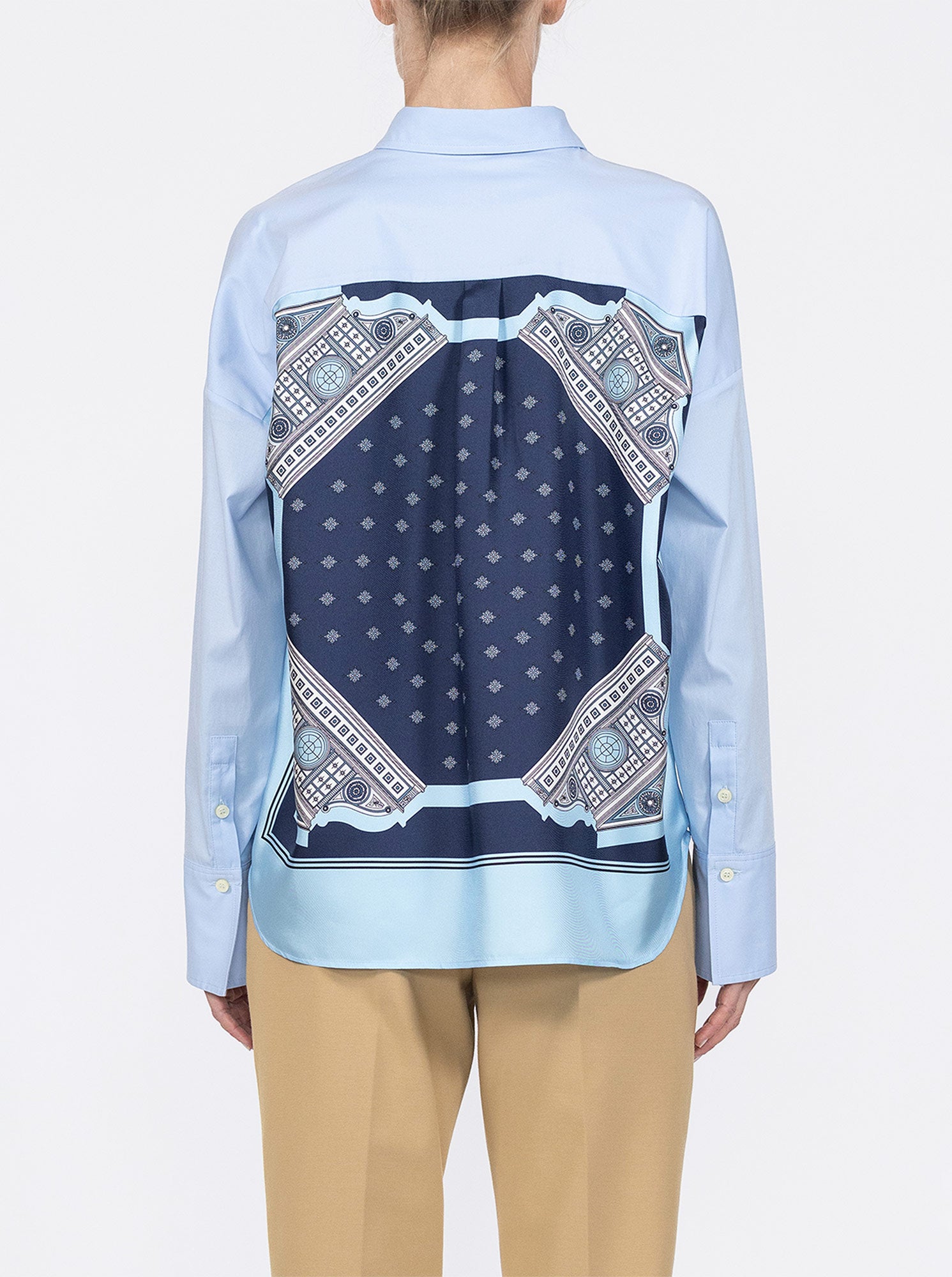 A signature silk twill scarf is combined at the back of the shirt to create an unexpected flair to a beautifully crafted shirt in a crisp cotton poplin.