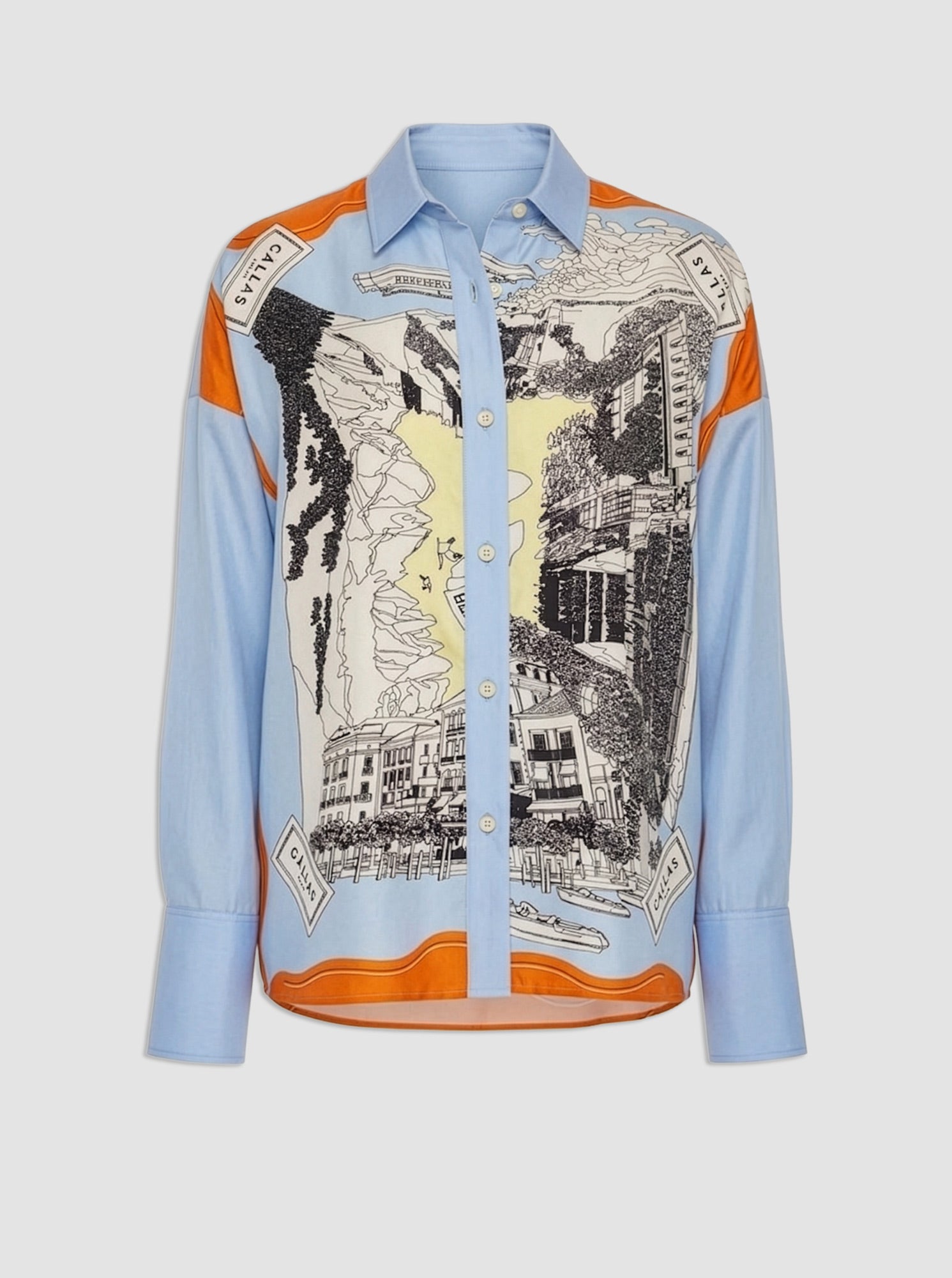 A signature silk twill scarf featuring the design of Lake Como landmarks is combined at the front of the shirt to create an unexpected flair to a beautifully crafted shirt in a crisp cotton poplin.