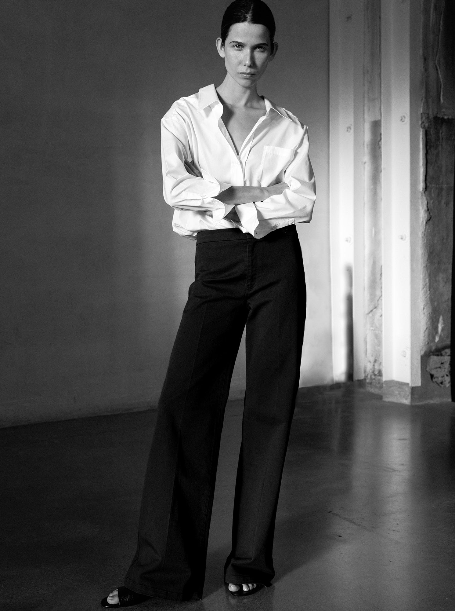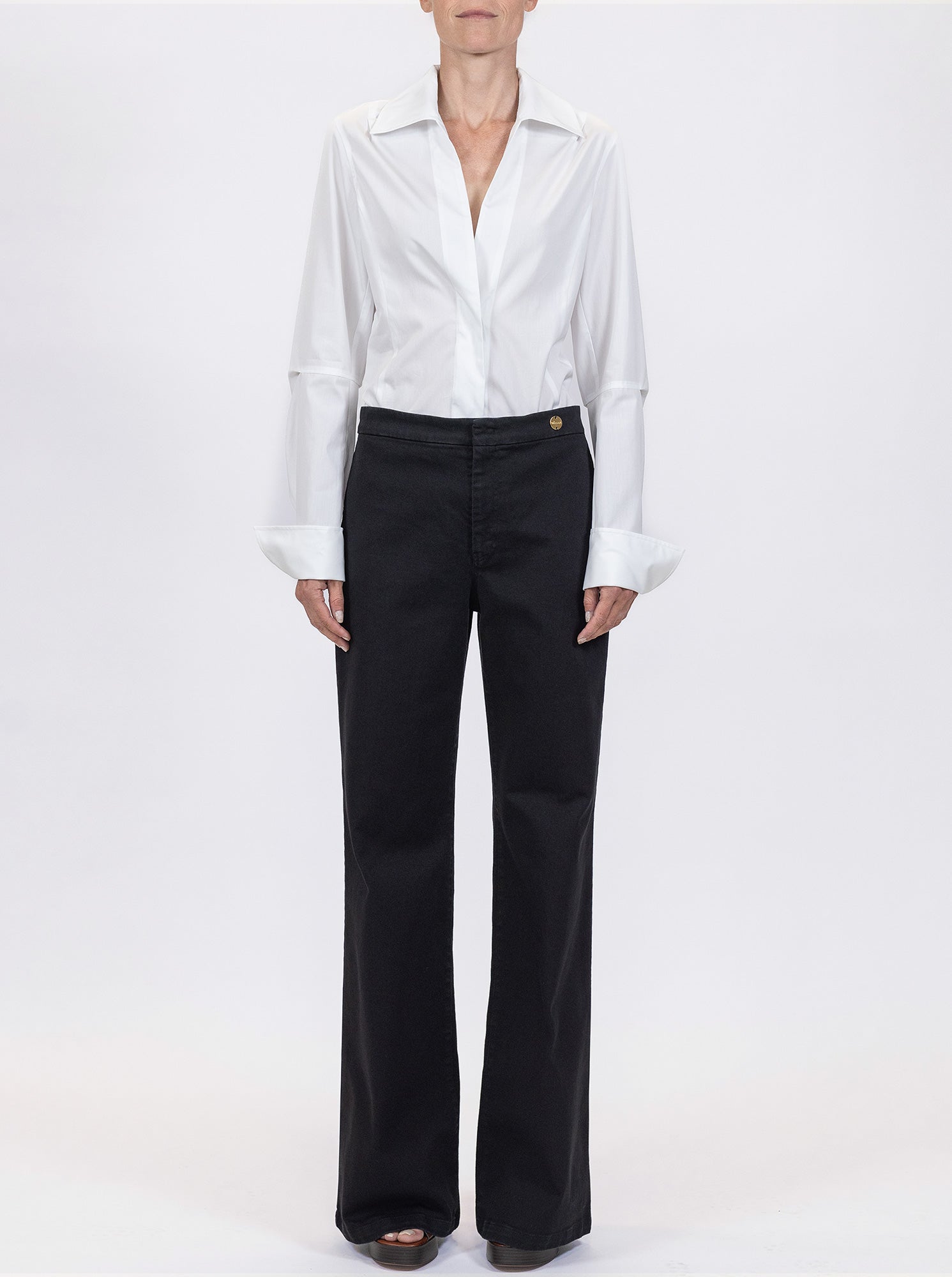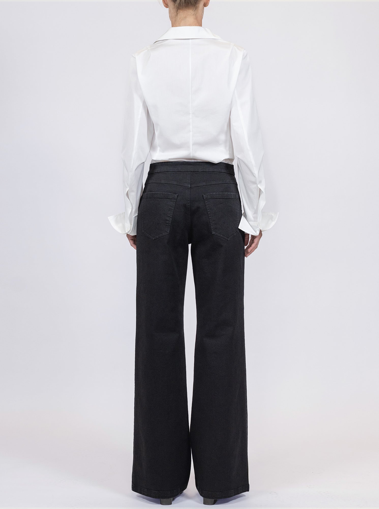 The Jane is cut with a flare leg shape featuring a contoured waistband that sits just below natural waist. With a high rise, the Jane trouser draws a long and lean silhouette. Made in a denim twill similar in weight to a classic 12oz. stretch denim.