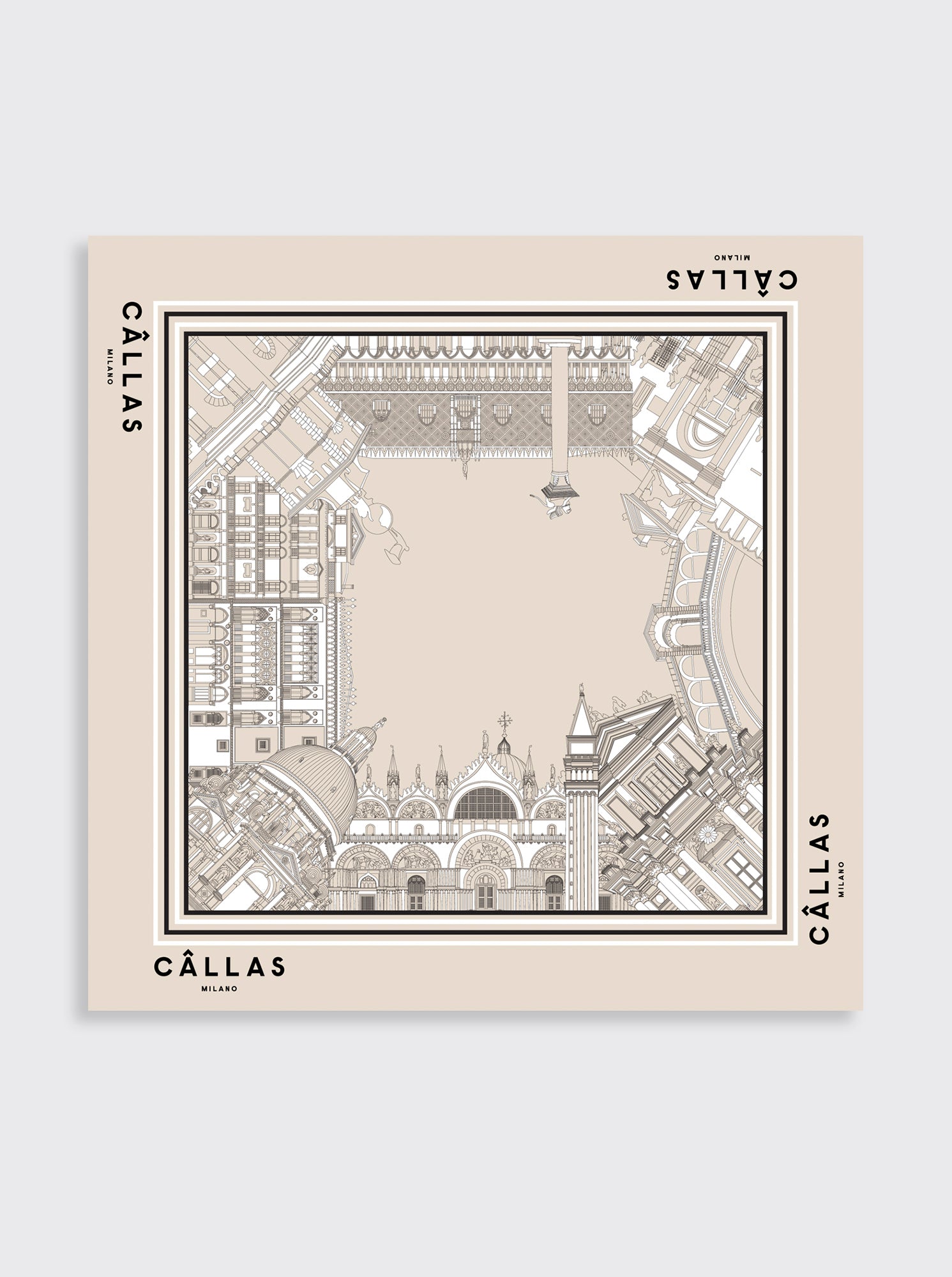A large silk scarf featuring scenes of Venice. The graphic design is an exclusive print which is part of the Câllas series of scarf designs which are limited editions. Made from a luminous Italian silk twill is a soft beige color with black illustrations and white accents.