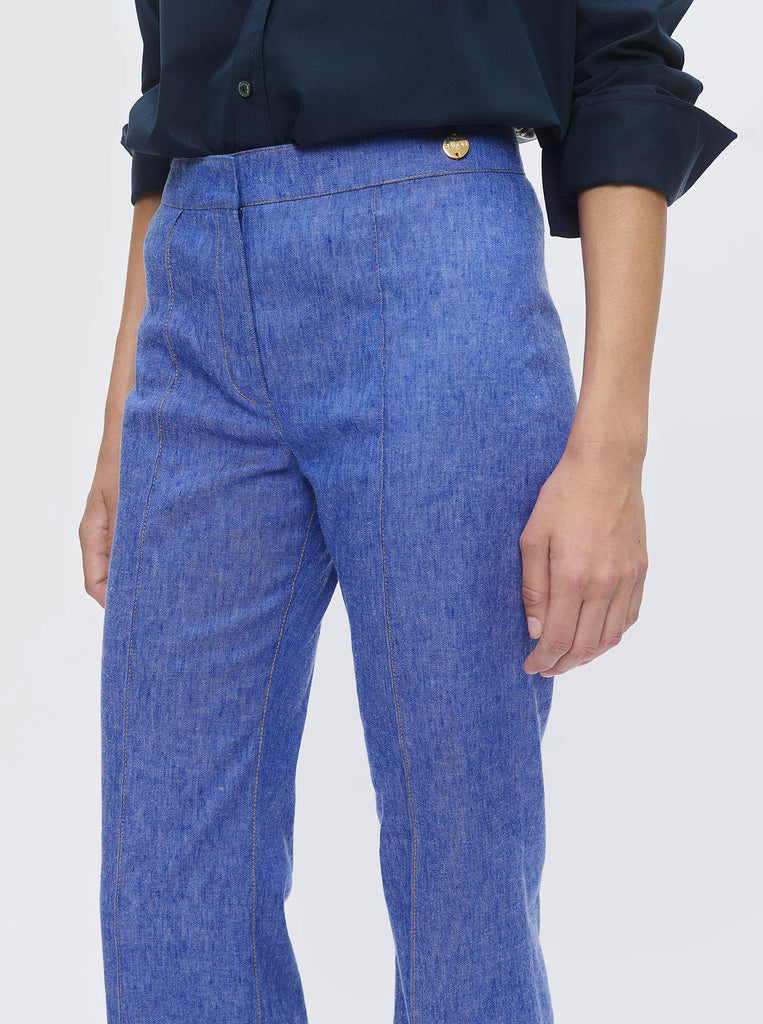 The Lola Denim is a high rise pant with a flat waistband fitting at the natural waist. The slim fitting silhouette is flared from the knee to the cropped hem. The Lola also features a stitched front crease to further elongate the flattering shape. It is made in a stretch denim fabric in a vibrant indigo blue with a vintage 70's look.